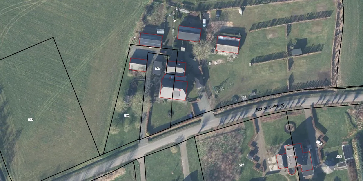 Het perceel waarop Schooltinkweg 2-a staat heeft een oppervlakte van 3,2 ha. Dit is een zeer groot perceel. De perceeloppervlakte wordt geregistreerd door het Kadaster. Gedetailleerde informatie over de maten van dit perceel kunt u vinden in het rapport Kadastrale kaart met maatvoering van Schooltinkweg 2-a.