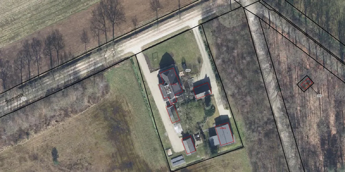 Het perceel waarop Stadsedijk 12-a staat heeft een oppervlakte van 3195 m². Dit is een zeer groot perceel. De perceeloppervlakte wordt geregistreerd door het Kadaster. Gedetailleerde informatie over de maten van dit perceel kunt u vinden in het rapport Kadastrale kaart met maatvoering van Stadsedijk 12-a.