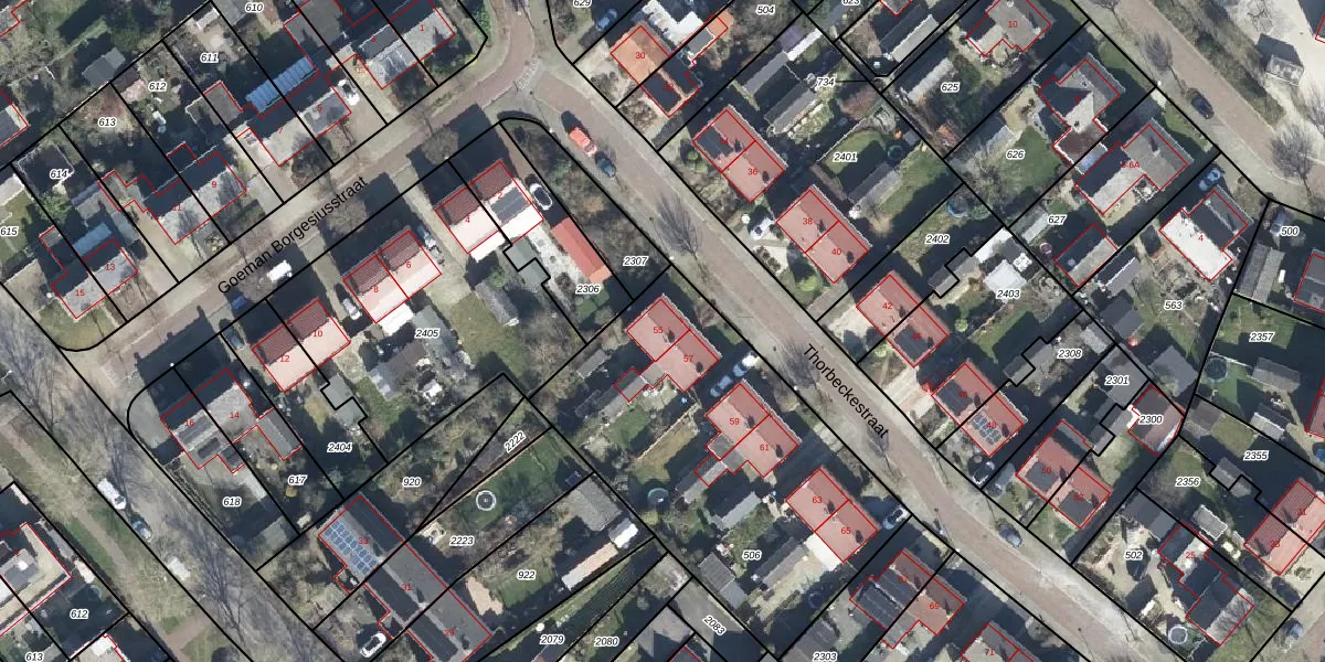 Het perceel waarop Thorbeckestraat 55 staat heeft een oppervlakte van 1610 m². Dit is een zeer groot perceel. De perceeloppervlakte wordt geregistreerd door het Kadaster. Gedetailleerde informatie over de maten van dit perceel kunt u vinden in het rapport Kadastrale kaart met maatvoering van Thorbeckestraat 55.