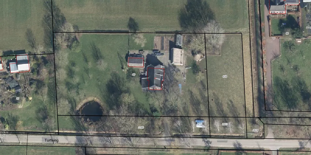 Het perceel waarop Turfweg 27 staat heeft een oppervlakte van 5245 m². Dit is een zeer groot perceel. De perceeloppervlakte wordt geregistreerd door het Kadaster. Gedetailleerde informatie over de maten van dit perceel kunt u vinden in het rapport Kadastrale kaart met maatvoering van Turfweg 27.