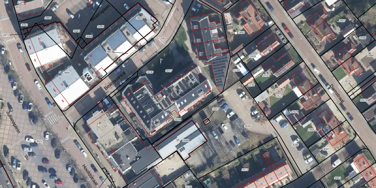Het perceel waarop Beatrixstraat 38 staat heeft een oppervlakte van 2484 m². Dit is een zeer groot perceel. De perceeloppervlakte wordt geregistreerd door het Kadaster. Gedetailleerde informatie over de maten van dit perceel kunt u vinden in het rapport Kadastrale kaart met maatvoering van Beatrixstraat 38.