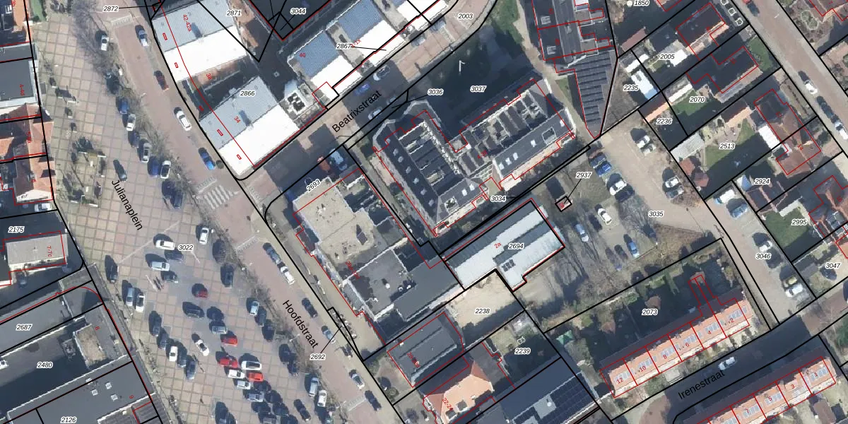 Het perceel waarop Beatrixstraat 8 staat heeft een oppervlakte van 2484 m². Dit is een zeer groot perceel. De perceeloppervlakte wordt geregistreerd door het Kadaster. Gedetailleerde informatie over de maten van dit perceel kunt u vinden in het rapport Kadastrale kaart met maatvoering van Beatrixstraat 8.