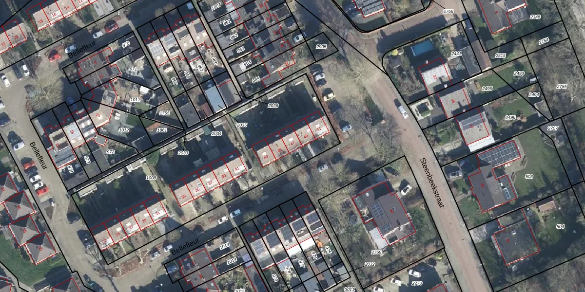 Het perceel waarop Bellefleur 47 staat heeft een oppervlakte van 2418 m². Dit is een zeer groot perceel. De perceeloppervlakte wordt geregistreerd door het Kadaster. Gedetailleerde informatie over de maten van dit perceel kunt u vinden in het rapport Kadastrale kaart met maatvoering van Bellefleur 47.
