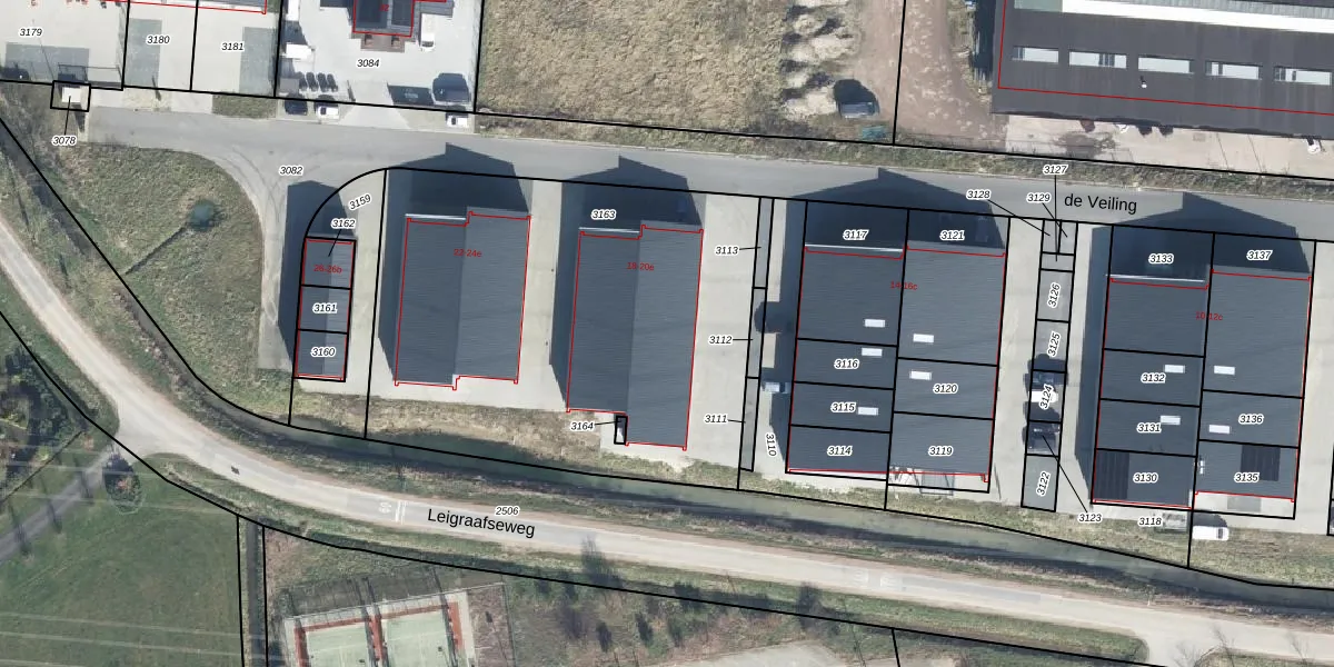 Het perceel waarop de Veiling 18-c staat heeft een oppervlakte van 2405 m². Dit is een zeer groot perceel. De perceeloppervlakte wordt geregistreerd door het Kadaster. Gedetailleerde informatie over de maten van dit perceel kunt u vinden in het rapport Kadastrale kaart met maatvoering van de Veiling 18-c.