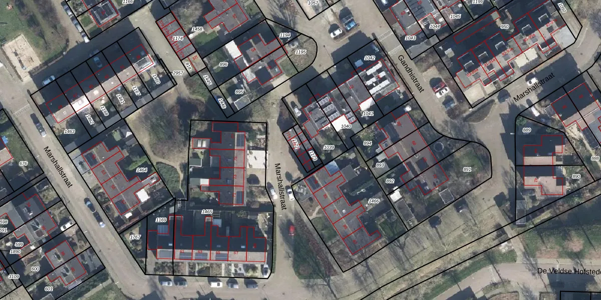 Het perceel waarop Marshallstraat 77-c staat heeft een oppervlakte van 59 m². Dit is een klein perceel. De perceeloppervlakte wordt geregistreerd door het Kadaster. Gedetailleerde informatie over de maten van dit perceel kunt u vinden in het rapport Kadastrale kaart met maatvoering van Marshallstraat 77-c.