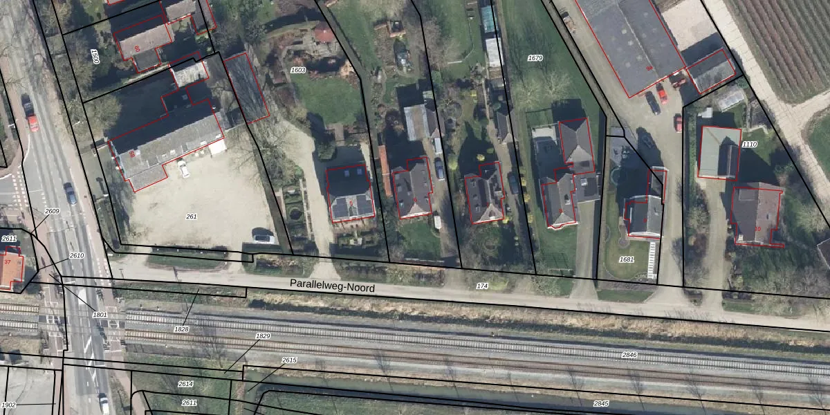 Het perceel waarop Parallelweg-Noord 6 staat heeft een oppervlakte van 2550 m². Dit is een zeer groot perceel. De perceeloppervlakte wordt geregistreerd door het Kadaster. Gedetailleerde informatie over de maten van dit perceel kunt u vinden in het rapport Kadastrale kaart met maatvoering van Parallelweg-Noord 6.
