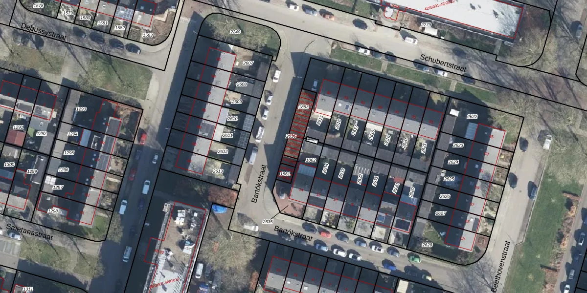 Bartókstraat 14-G005 is gelegen op kadastraal perceel ZVN02H1863. Deze kadastrale aanduiding is uniek en wordt gebruikt door het Kadaster om eigendomsrechten en andere zakelijke rechten vast te leggen. Het perceel maakt onderdeel uit van de kadastrale gemeente Oud-Zevenaar.