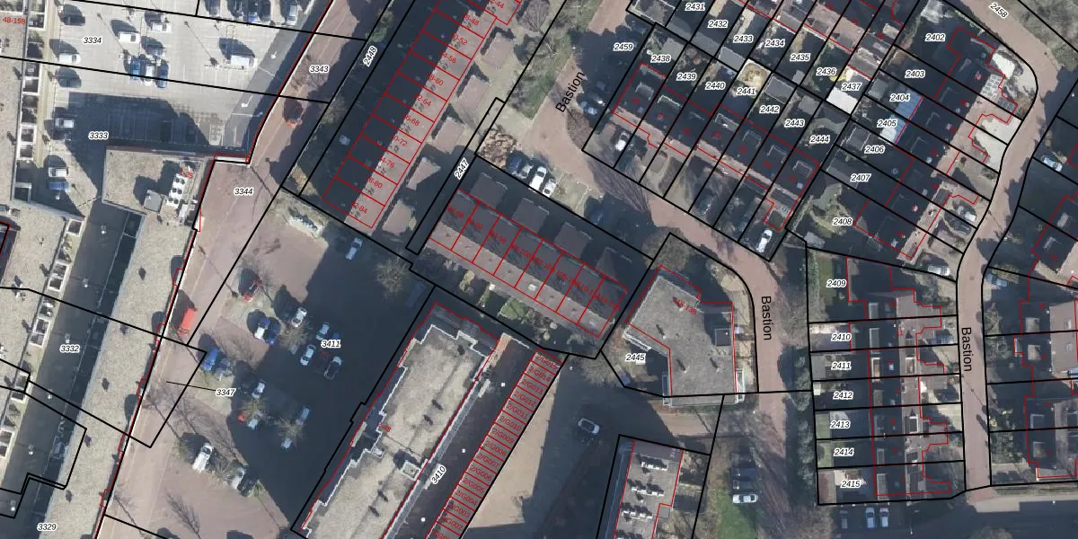 Het perceel waarop Bastion 104 staat heeft een oppervlakte van 2690 m². Dit is een zeer groot perceel. De perceeloppervlakte wordt geregistreerd door het Kadaster. Gedetailleerde informatie over de maten van dit perceel kunt u vinden in het rapport Kadastrale kaart met maatvoering van Bastion 104.