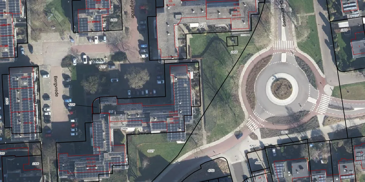 Het perceel waarop Bergvrede 185 staat heeft een oppervlakte van 2265 m². Dit is een zeer groot perceel. De perceeloppervlakte wordt geregistreerd door het Kadaster. Gedetailleerde informatie over de maten van dit perceel kunt u vinden in het rapport Kadastrale kaart met maatvoering van Bergvrede 185.