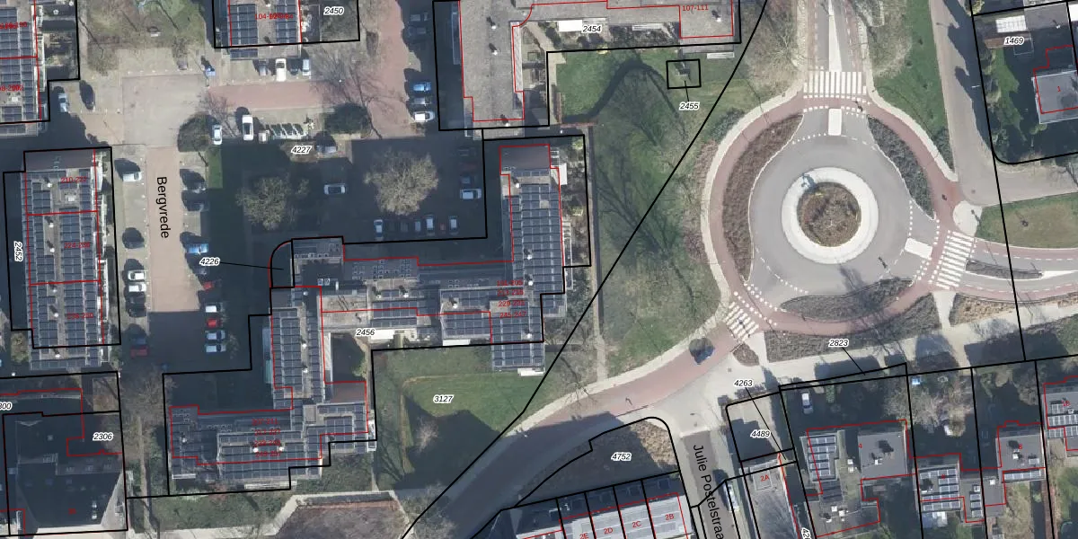 Het perceel waarop Bergvrede 187 staat heeft een oppervlakte van 2265 m². Dit is een zeer groot perceel. De perceeloppervlakte wordt geregistreerd door het Kadaster. Gedetailleerde informatie over de maten van dit perceel kunt u vinden in het rapport Kadastrale kaart met maatvoering van Bergvrede 187.