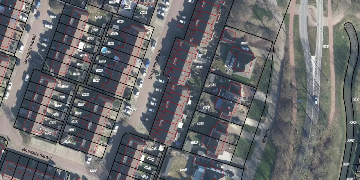 Het perceel waarop Brusselsestraat 43 staat heeft een oppervlakte van 1924 m². Dit is een zeer groot perceel. De perceeloppervlakte wordt geregistreerd door het Kadaster. Gedetailleerde informatie over de maten van dit perceel kunt u vinden in het rapport Kadastrale kaart met maatvoering van Brusselsestraat 43.