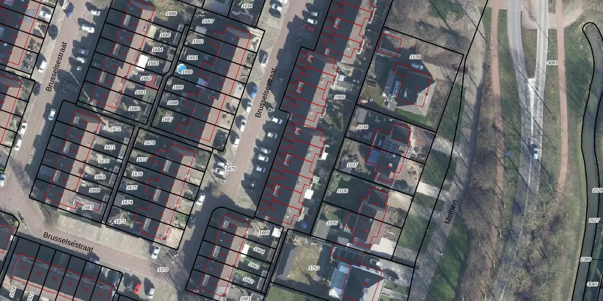Het perceel waarop Brusselsestraat 45 staat heeft een oppervlakte van 1924 m². Dit is een zeer groot perceel. De perceeloppervlakte wordt geregistreerd door het Kadaster. Gedetailleerde informatie over de maten van dit perceel kunt u vinden in het rapport Kadastrale kaart met maatvoering van Brusselsestraat 45.