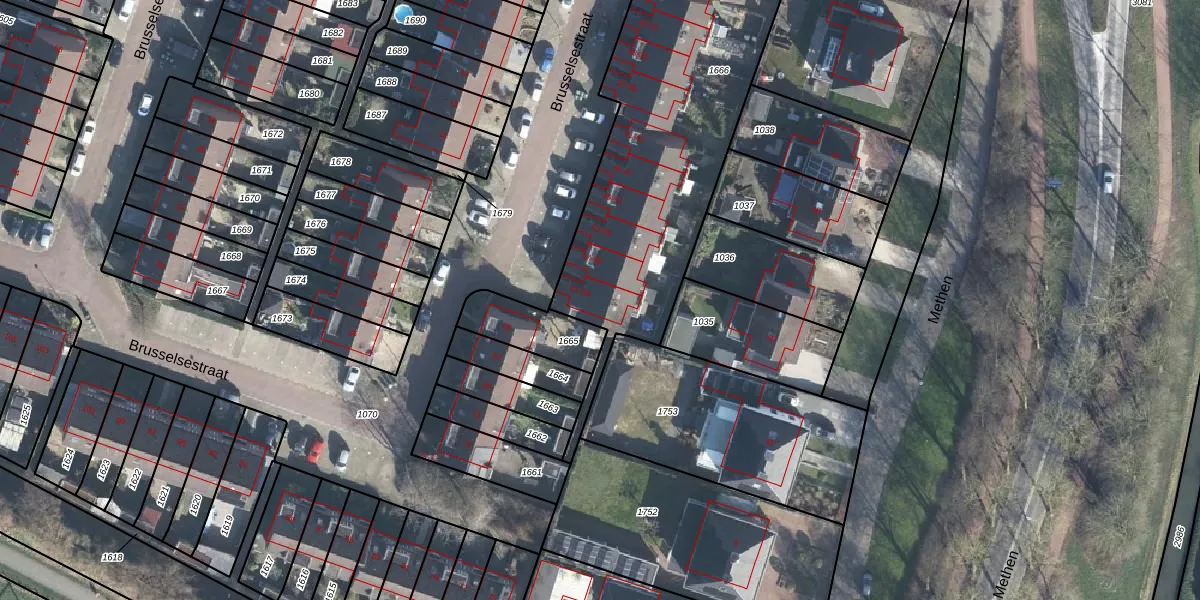 Het perceel waarop Brusselsestraat 61 staat heeft een oppervlakte van 1924 m². Dit is een zeer groot perceel. De perceeloppervlakte wordt geregistreerd door het Kadaster. Gedetailleerde informatie over de maten van dit perceel kunt u vinden in het rapport Kadastrale kaart met maatvoering van Brusselsestraat 61.