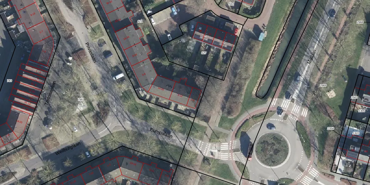 Het perceel waarop Europalaan 10 staat heeft een oppervlakte van 2482 m². Dit is een zeer groot perceel. De perceeloppervlakte wordt geregistreerd door het Kadaster. Gedetailleerde informatie over de maten van dit perceel kunt u vinden in het rapport Kadastrale kaart met maatvoering van Europalaan 10.