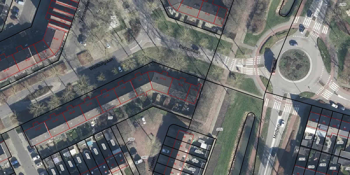 Het perceel waarop Europalaan 7 staat heeft een oppervlakte van 2448 m². Dit is een zeer groot perceel. De perceeloppervlakte wordt geregistreerd door het Kadaster. Gedetailleerde informatie over de maten van dit perceel kunt u vinden in het rapport Kadastrale kaart met maatvoering van Europalaan 7.