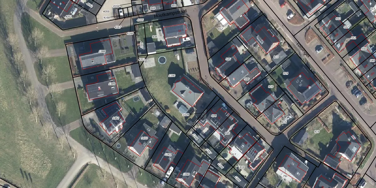 Het perceel waarop Houtkampstraat 20 staat heeft een oppervlakte van 1110 m². Dit is een zeer groot perceel. De perceeloppervlakte wordt geregistreerd door het Kadaster. Gedetailleerde informatie over de maten van dit perceel kunt u vinden in het rapport Kadastrale kaart met maatvoering van Houtkampstraat 20.