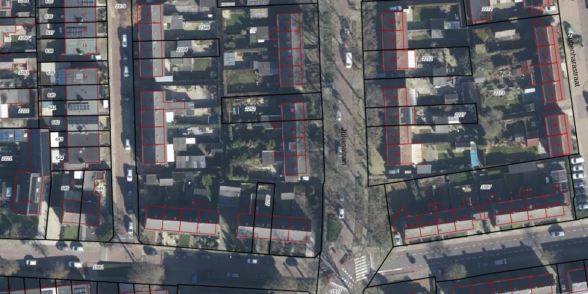 Het perceel waarop Julianalaan 27 staat heeft een oppervlakte van 6813 m². Dit is een zeer groot perceel. De perceeloppervlakte wordt geregistreerd door het Kadaster. Gedetailleerde informatie over de maten van dit perceel kunt u vinden in het rapport Kadastrale kaart met maatvoering van Julianalaan 27.