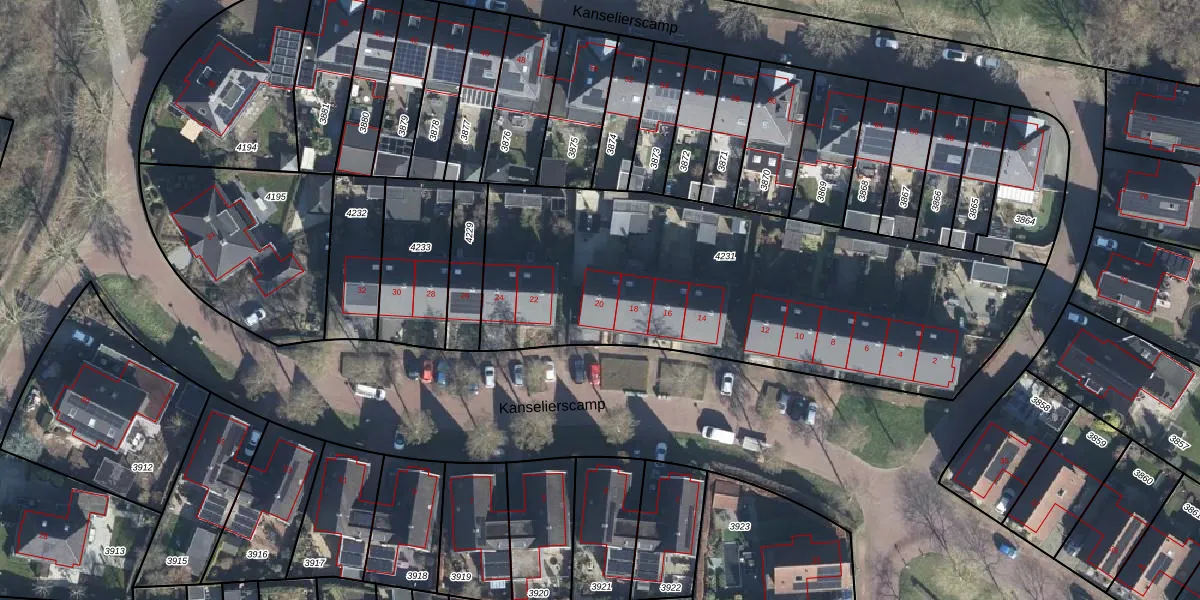 Het perceel waarop Kanselierscamp 20 staat heeft een oppervlakte van 2241 m². Dit is een zeer groot perceel. De perceeloppervlakte wordt geregistreerd door het Kadaster. Gedetailleerde informatie over de maten van dit perceel kunt u vinden in het rapport Kadastrale kaart met maatvoering van Kanselierscamp 20.