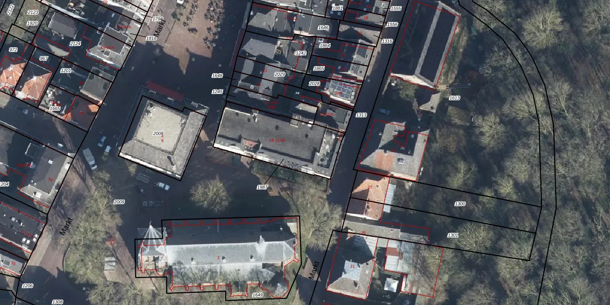 Het perceel waarop Markt 21-2 staat heeft een oppervlakte van 630 m². Dit is een groot perceel. De perceeloppervlakte wordt geregistreerd door het Kadaster. Gedetailleerde informatie over de maten van dit perceel kunt u vinden in het rapport Kadastrale kaart met maatvoering van Markt 21-2.