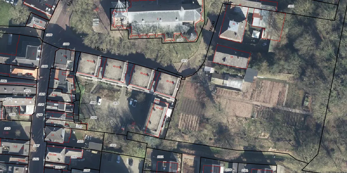 Het perceel waarop Markt 35-B staat heeft een oppervlakte van 2260 m². Dit is een zeer groot perceel. De perceeloppervlakte wordt geregistreerd door het Kadaster. Gedetailleerde informatie over de maten van dit perceel kunt u vinden in het rapport Kadastrale kaart met maatvoering van Markt 35-B.