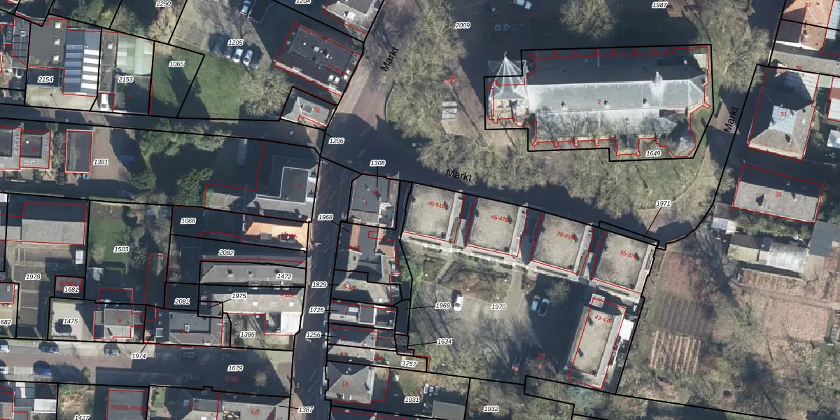 Het perceel waarop Markt 51-B staat heeft een oppervlakte van 2260 m². Dit is een zeer groot perceel. De perceeloppervlakte wordt geregistreerd door het Kadaster. Gedetailleerde informatie over de maten van dit perceel kunt u vinden in het rapport Kadastrale kaart met maatvoering van Markt 51-B.