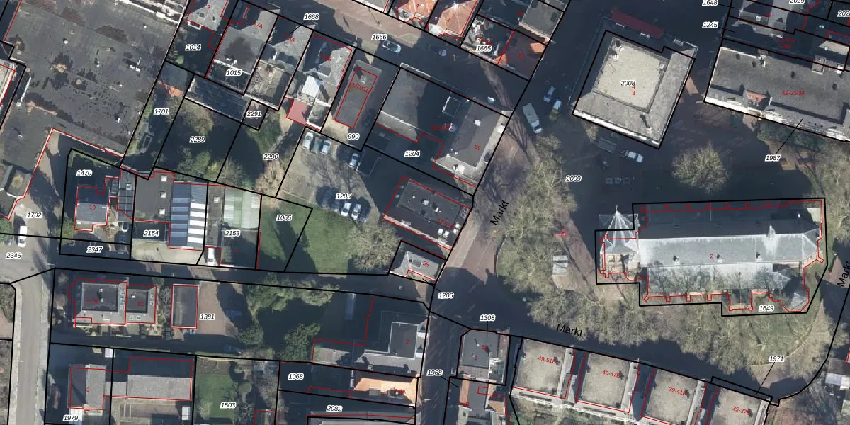 Het perceel waarop Markt 57-D staat heeft een oppervlakte van 1020 m². Dit is een zeer groot perceel. De perceeloppervlakte wordt geregistreerd door het Kadaster. Gedetailleerde informatie over de maten van dit perceel kunt u vinden in het rapport Kadastrale kaart met maatvoering van Markt 57-D.
