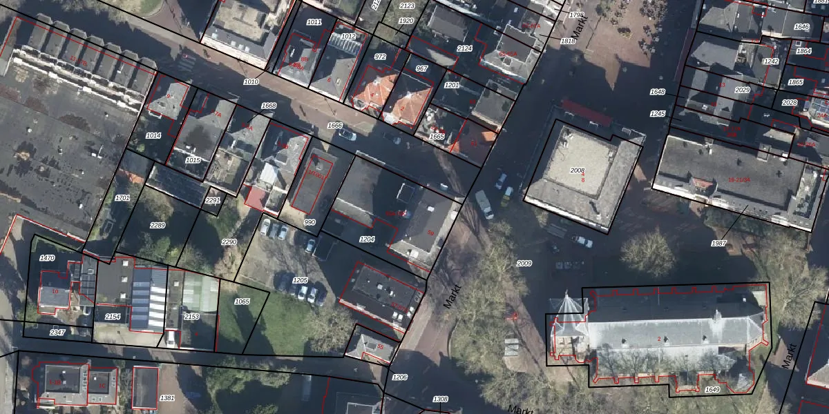 Het perceel waarop Markt 59-C staat heeft een oppervlakte van 570 m². Dit is een groot perceel. De perceeloppervlakte wordt geregistreerd door het Kadaster. Gedetailleerde informatie over de maten van dit perceel kunt u vinden in het rapport Kadastrale kaart met maatvoering van Markt 59-C.