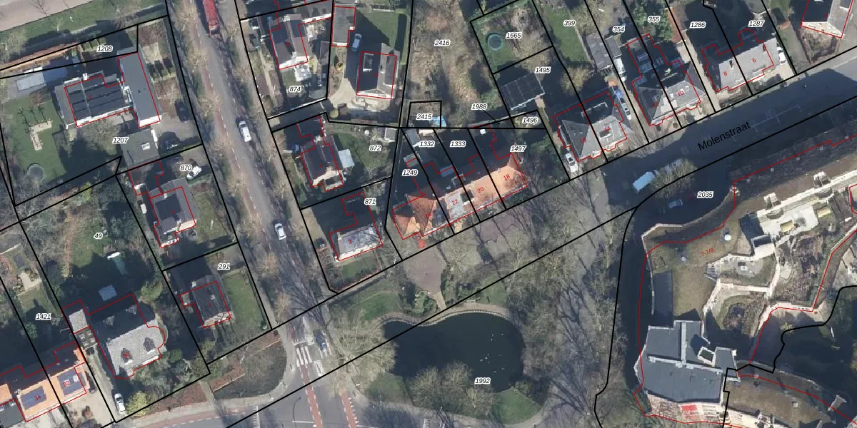 Het perceel waarop Molenstraat 24 staat heeft een oppervlakte van 256 m². Dit is een middelgroot perceel. De perceeloppervlakte wordt geregistreerd door het Kadaster. Gedetailleerde informatie over de maten van dit perceel kunt u vinden in het rapport Kadastrale kaart met maatvoering van Molenstraat 24.