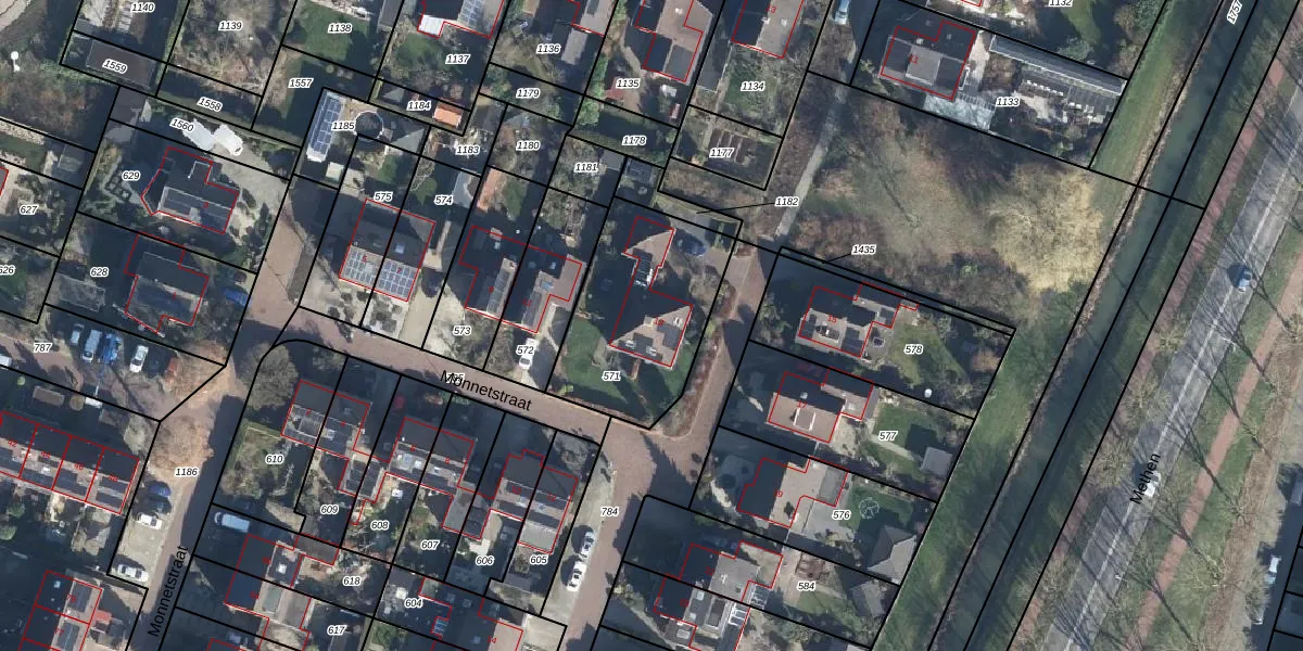Het perceel waarop Monnetstraat 13 staat heeft een oppervlakte van 630 m². Dit is een groot perceel. De perceeloppervlakte wordt geregistreerd door het Kadaster. Gedetailleerde informatie over de maten van dit perceel kunt u vinden in het rapport Kadastrale kaart met maatvoering van Monnetstraat 13.