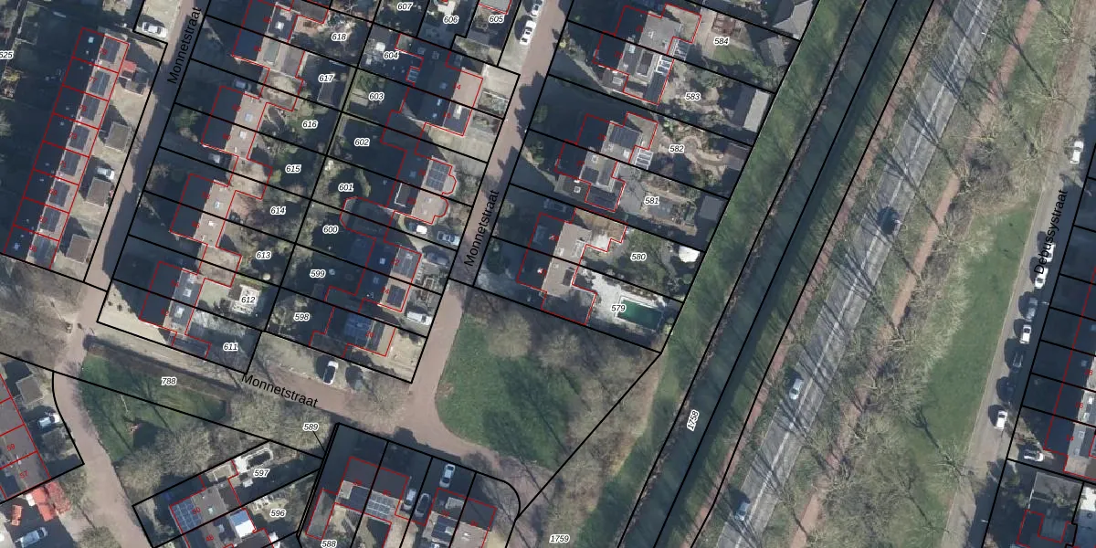 Het perceel waarop Monnetstraat 31 staat heeft een oppervlakte van 369 m². Dit is een groot perceel. De perceeloppervlakte wordt geregistreerd door het Kadaster. Gedetailleerde informatie over de maten van dit perceel kunt u vinden in het rapport Kadastrale kaart met maatvoering van Monnetstraat 31.