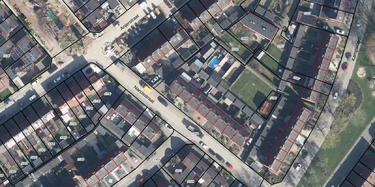 Het perceel waarop Narcisstraat 14 staat heeft een oppervlakte van 4333 m². Dit is een zeer groot perceel. De perceeloppervlakte wordt geregistreerd door het Kadaster. Gedetailleerde informatie over de maten van dit perceel kunt u vinden in het rapport Kadastrale kaart met maatvoering van Narcisstraat 14.