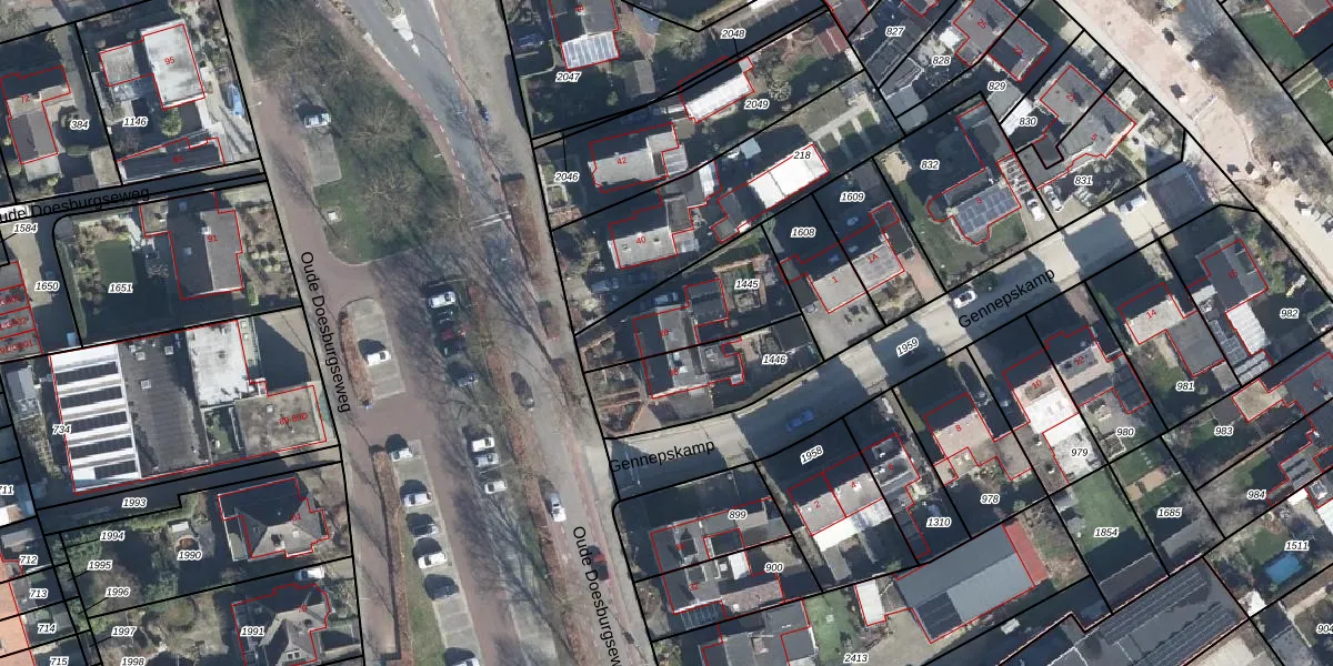 Het perceel waarop Oude Doesburgseweg 38 staat heeft een oppervlakte van 343 m². Dit is een groot perceel. De perceeloppervlakte wordt geregistreerd door het Kadaster. Gedetailleerde informatie over de maten van dit perceel kunt u vinden in het rapport Kadastrale kaart met maatvoering van Oude Doesburgseweg 38.