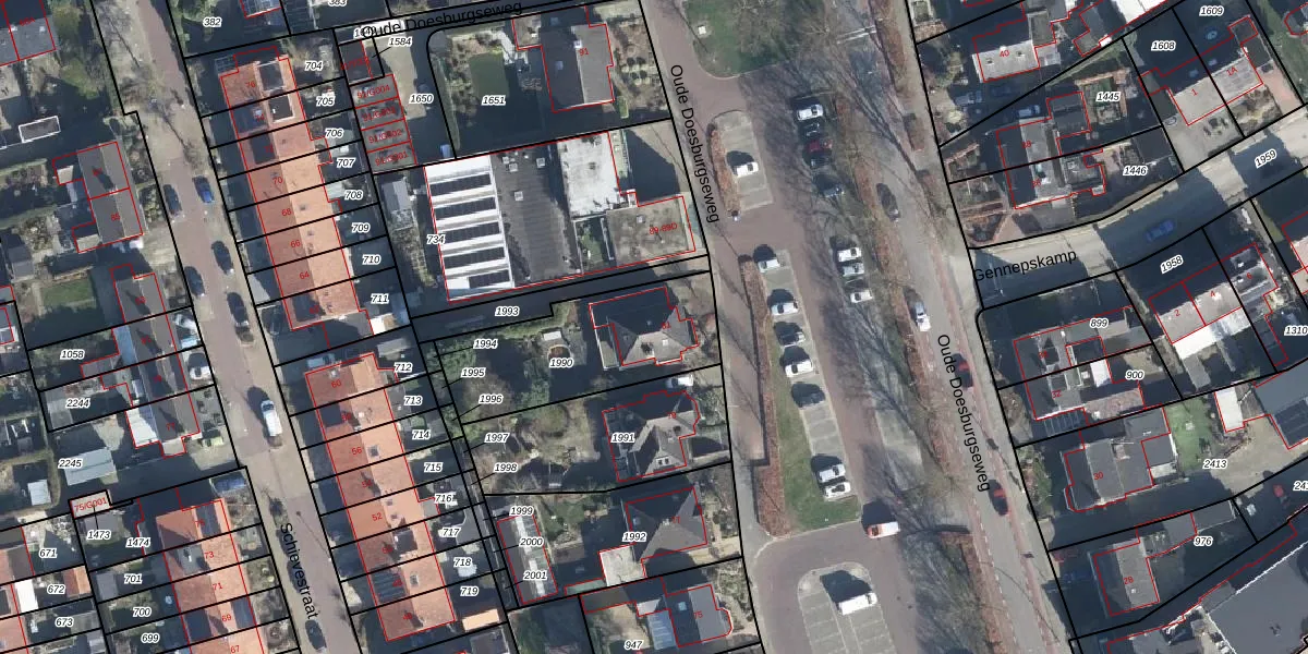 Het perceel waarop Oude Doesburgseweg 81 staat heeft een oppervlakte van 595 m². Dit is een groot perceel. De perceeloppervlakte wordt geregistreerd door het Kadaster. Gedetailleerde informatie over de maten van dit perceel kunt u vinden in het rapport Kadastrale kaart met maatvoering van Oude Doesburgseweg 81.