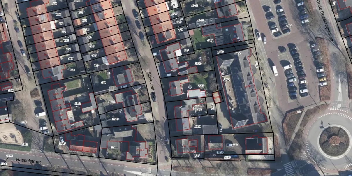 Het perceel waarop Schievestraat 20 staat heeft een oppervlakte van 442 m². Dit is een groot perceel. De perceeloppervlakte wordt geregistreerd door het Kadaster. Gedetailleerde informatie over de maten van dit perceel kunt u vinden in het rapport Kadastrale kaart met maatvoering van Schievestraat 20.