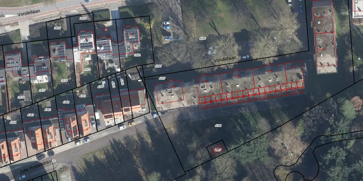 Het perceel waarop Vondellaan 34 staat heeft een oppervlakte van 5245 m². Dit is een zeer groot perceel. De perceeloppervlakte wordt geregistreerd door het Kadaster. Gedetailleerde informatie over de maten van dit perceel kunt u vinden in het rapport Kadastrale kaart met maatvoering van Vondellaan 34.