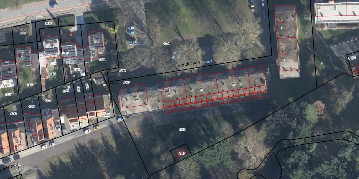 Het perceel waarop Vondellaan 46 staat heeft een oppervlakte van 5245 m². Dit is een zeer groot perceel. De perceeloppervlakte wordt geregistreerd door het Kadaster. Gedetailleerde informatie over de maten van dit perceel kunt u vinden in het rapport Kadastrale kaart met maatvoering van Vondellaan 46.