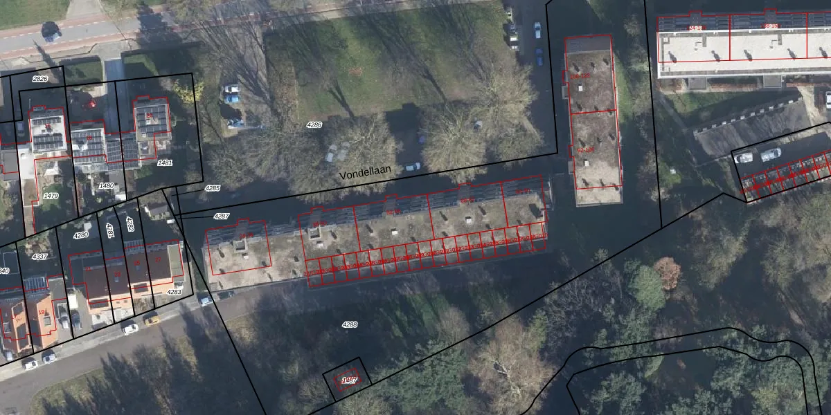 Het perceel waarop Vondellaan 60 staat heeft een oppervlakte van 5245 m². Dit is een zeer groot perceel. De perceeloppervlakte wordt geregistreerd door het Kadaster. Gedetailleerde informatie over de maten van dit perceel kunt u vinden in het rapport Kadastrale kaart met maatvoering van Vondellaan 60.