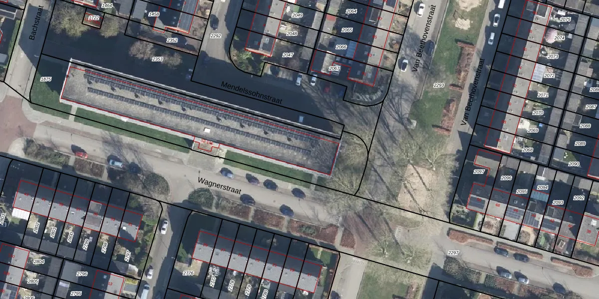 Het perceel waarop Wagnerstraat 54 staat heeft een oppervlakte van 1960 m². Dit is een zeer groot perceel. De perceeloppervlakte wordt geregistreerd door het Kadaster. Gedetailleerde informatie over de maten van dit perceel kunt u vinden in het rapport Kadastrale kaart met maatvoering van Wagnerstraat 54.