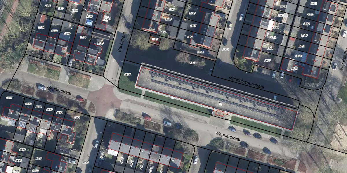 Het perceel waarop Wagnerstraat 68 staat heeft een oppervlakte van 1960 m². Dit is een zeer groot perceel. De perceeloppervlakte wordt geregistreerd door het Kadaster. Gedetailleerde informatie over de maten van dit perceel kunt u vinden in het rapport Kadastrale kaart met maatvoering van Wagnerstraat 68.