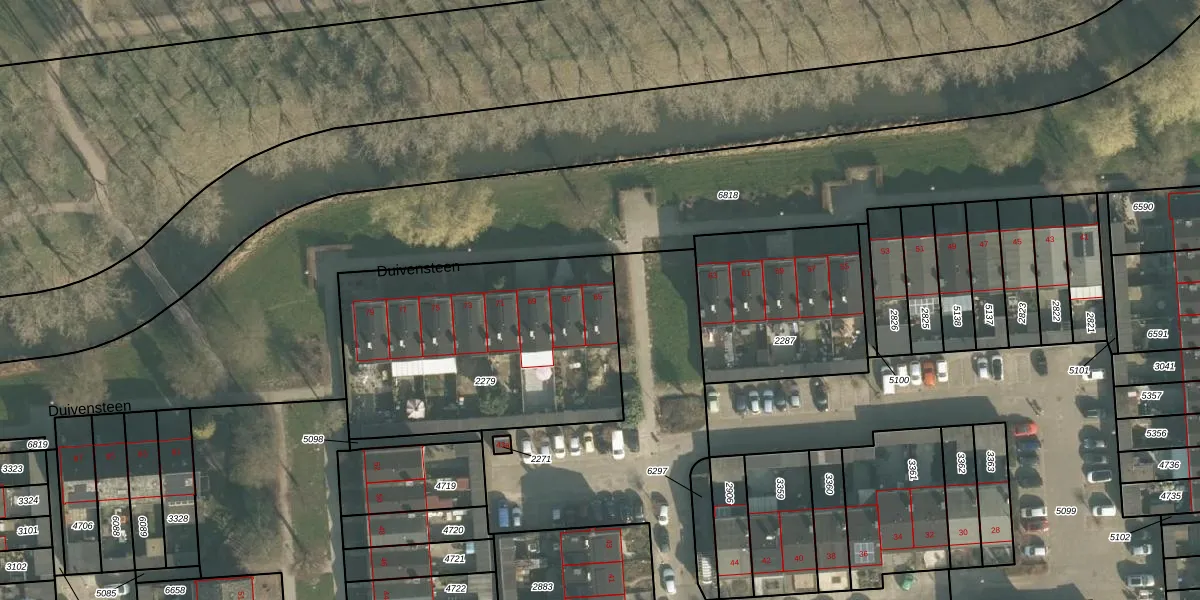 Het perceel waarop Duivensteen 65 staat heeft een oppervlakte van 1275 m². Dit is een zeer groot perceel. De perceeloppervlakte wordt geregistreerd door het Kadaster. Gedetailleerde informatie over de maten van dit perceel kunt u vinden in het rapport Kadastrale kaart met maatvoering van Duivensteen 65.