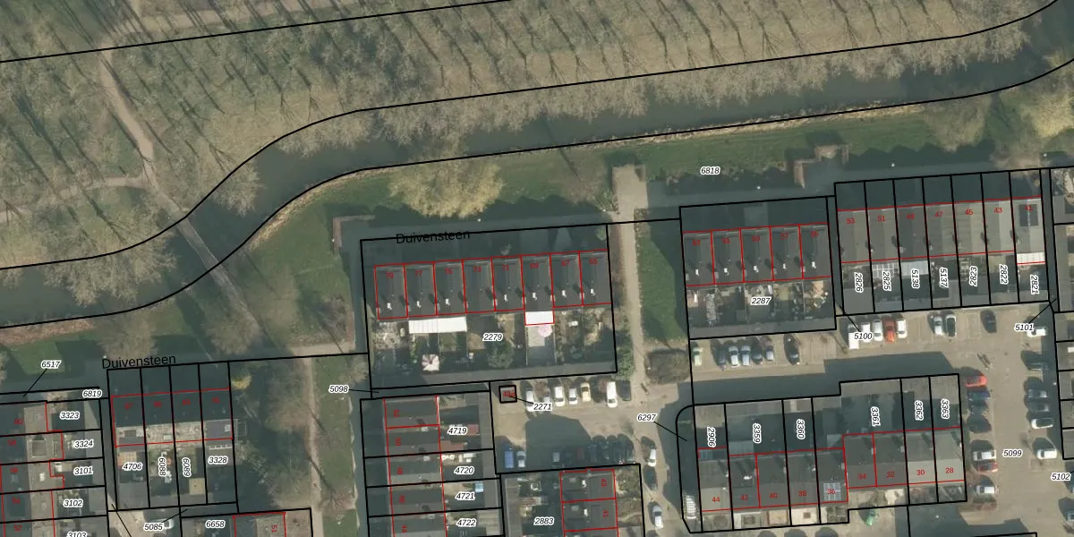 Het perceel waarop Duivensteen 69 staat heeft een oppervlakte van 1275 m². Dit is een zeer groot perceel. De perceeloppervlakte wordt geregistreerd door het Kadaster. Gedetailleerde informatie over de maten van dit perceel kunt u vinden in het rapport Kadastrale kaart met maatvoering van Duivensteen 69.