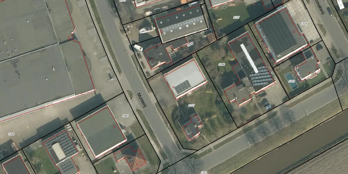 Het perceel waarop Munterij 15 staat heeft een oppervlakte van 1630 m². Dit is een zeer groot perceel. De perceeloppervlakte wordt geregistreerd door het Kadaster. Gedetailleerde informatie over de maten van dit perceel kunt u vinden in het rapport Kadastrale kaart met maatvoering van Munterij 15.