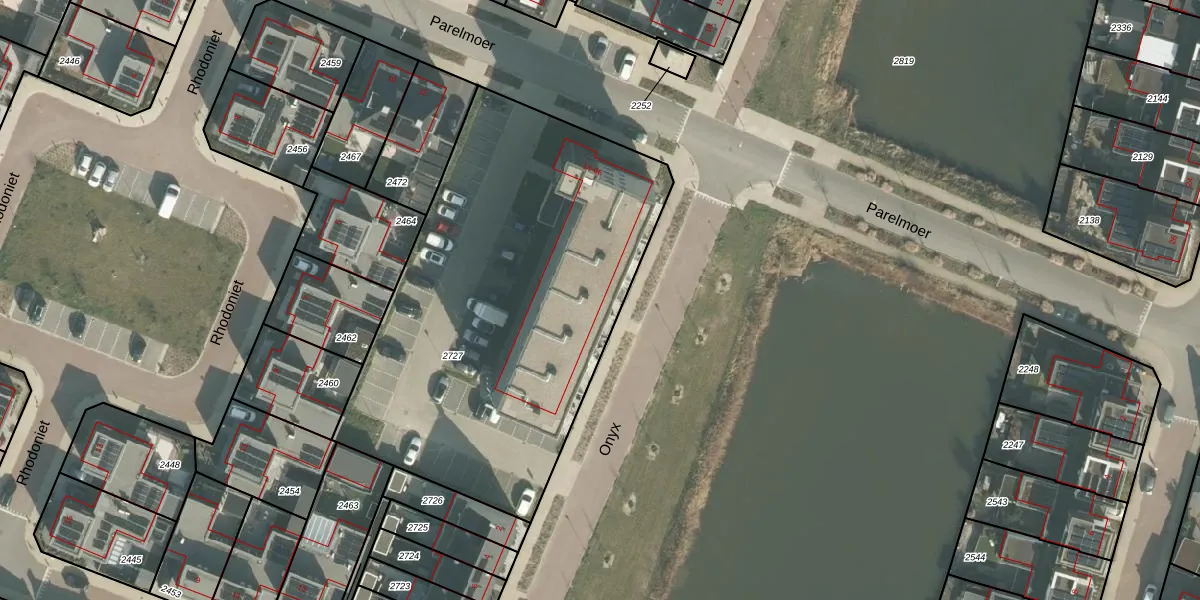 Het perceel waarop Parelmoer 14 staat heeft een oppervlakte van 2295 m². Dit is een zeer groot perceel. De perceeloppervlakte wordt geregistreerd door het Kadaster. Gedetailleerde informatie over de maten van dit perceel kunt u vinden in het rapport Kadastrale kaart met maatvoering van Parelmoer 14.