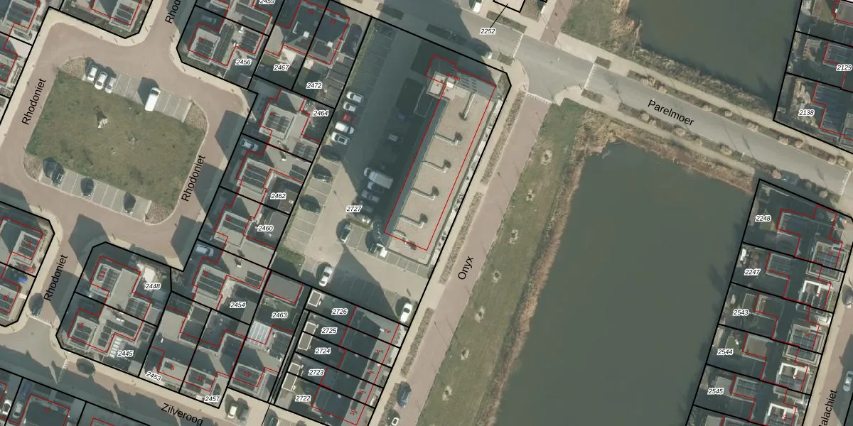 Het perceel waarop Parelmoer 42 staat heeft een oppervlakte van 2295 m². Dit is een zeer groot perceel. De perceeloppervlakte wordt geregistreerd door het Kadaster. Gedetailleerde informatie over de maten van dit perceel kunt u vinden in het rapport Kadastrale kaart met maatvoering van Parelmoer 42.