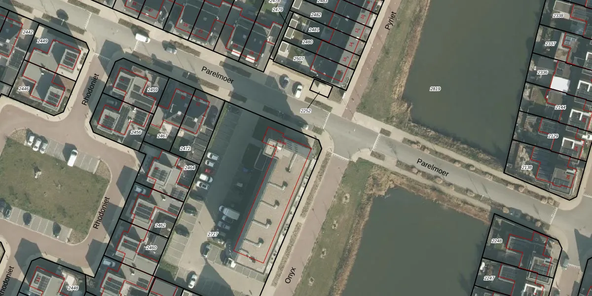 Het perceel waarop Parelmoer 44 staat heeft een oppervlakte van 2295 m². Dit is een zeer groot perceel. De perceeloppervlakte wordt geregistreerd door het Kadaster. Gedetailleerde informatie over de maten van dit perceel kunt u vinden in het rapport Kadastrale kaart met maatvoering van Parelmoer 44.