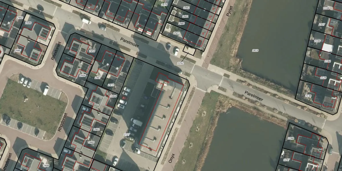 Het perceel waarop Parelmoer 56 staat heeft een oppervlakte van 2295 m². Dit is een zeer groot perceel. De perceeloppervlakte wordt geregistreerd door het Kadaster. Gedetailleerde informatie over de maten van dit perceel kunt u vinden in het rapport Kadastrale kaart met maatvoering van Parelmoer 56.
