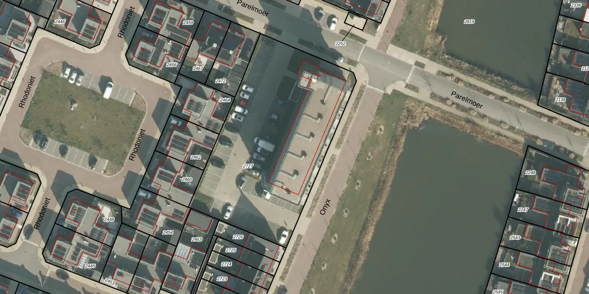 Het perceel waarop Parelmoer 64 staat heeft een oppervlakte van 2295 m². Dit is een zeer groot perceel. De perceeloppervlakte wordt geregistreerd door het Kadaster. Gedetailleerde informatie over de maten van dit perceel kunt u vinden in het rapport Kadastrale kaart met maatvoering van Parelmoer 64.