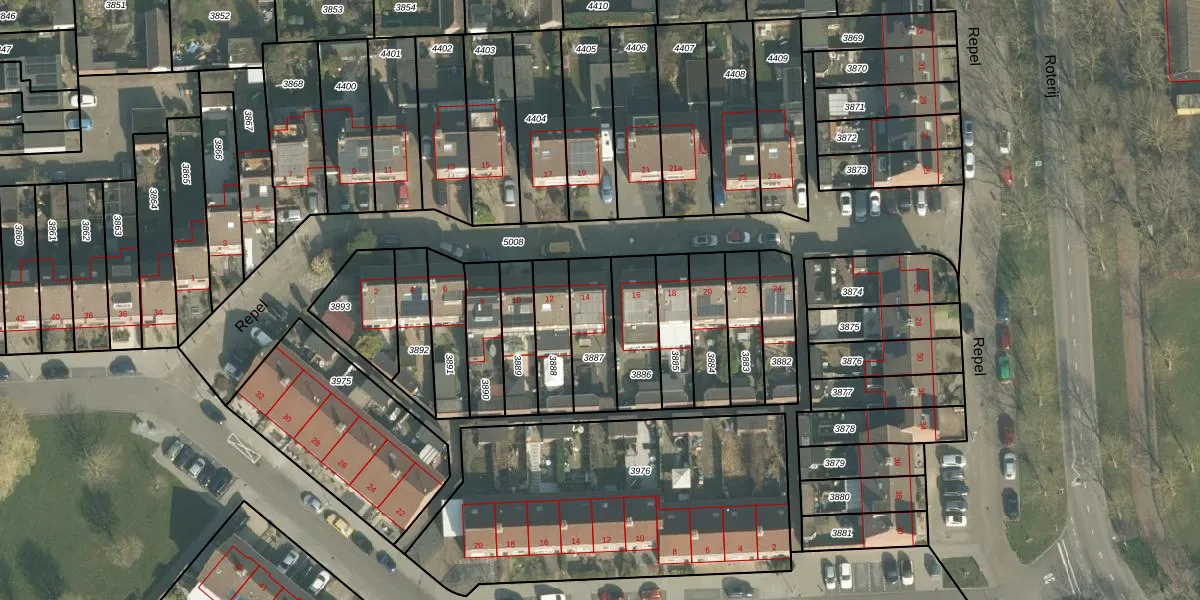 Het perceel waarop Repel 14 staat heeft een oppervlakte van 189 m². Dit is een middelgroot perceel. De perceeloppervlakte wordt geregistreerd door het Kadaster. Gedetailleerde informatie over de maten van dit perceel kunt u vinden in het rapport Kadastrale kaart met maatvoering van Repel 14.