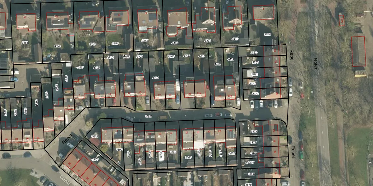 Het perceel waarop Repel 21 staat heeft een oppervlakte van 257 m². Dit is een middelgroot perceel. De perceeloppervlakte wordt geregistreerd door het Kadaster. Gedetailleerde informatie over de maten van dit perceel kunt u vinden in het rapport Kadastrale kaart met maatvoering van Repel 21.
