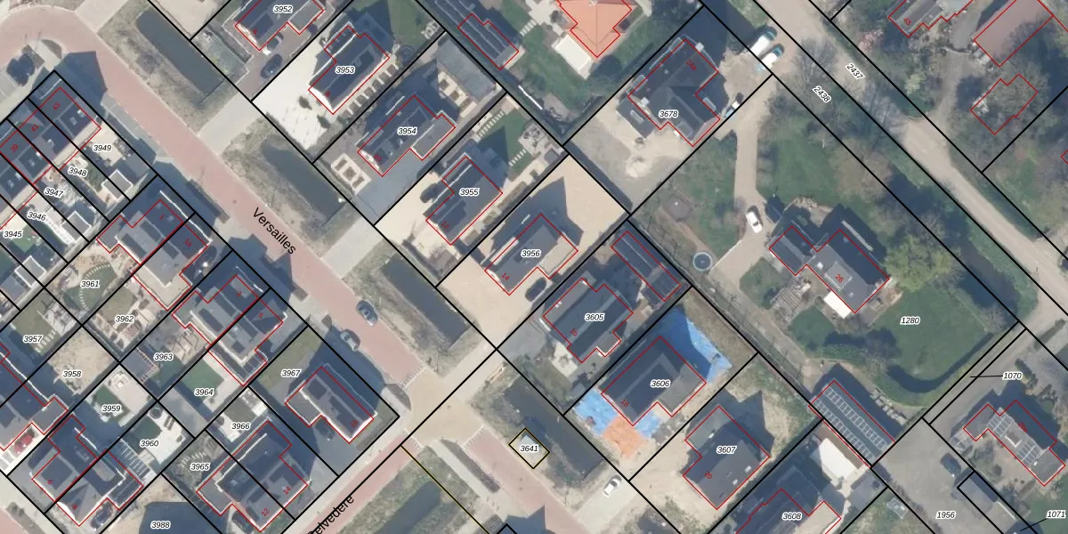Het perceel waarop Versailles 14 staat heeft een oppervlakte van 579 m². Dit is een groot perceel. De perceeloppervlakte wordt geregistreerd door het Kadaster. Gedetailleerde informatie over de maten van dit perceel kunt u vinden in het rapport Kadastrale kaart met maatvoering van Versailles 14.